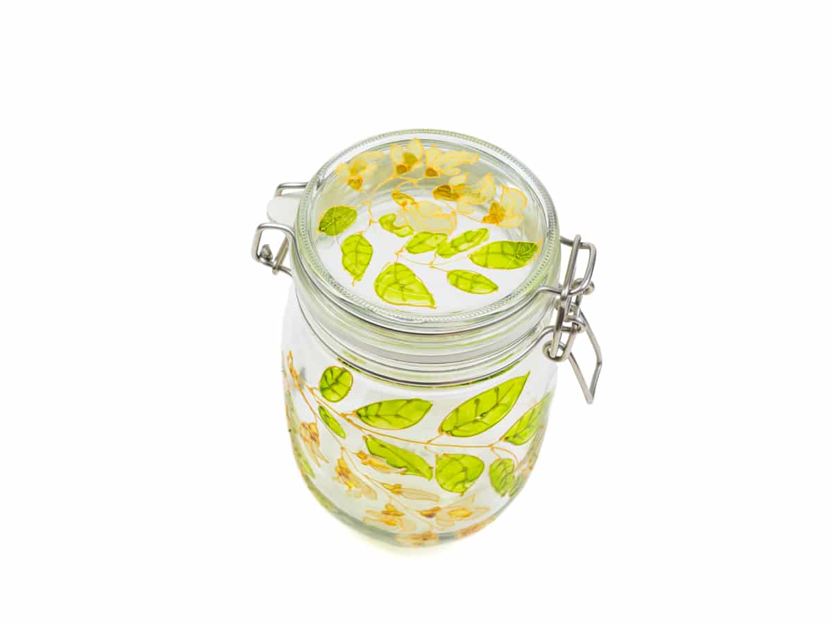 Borcan pictat manual cu florile arborelui de salcam pentru o bucatarie vesela si luminoasa. Borcanul este practic si foarte util, are inchidere etansa si pastreaza cu succes mierea, cerealele, florile de ceai dulceata sau condimentele.