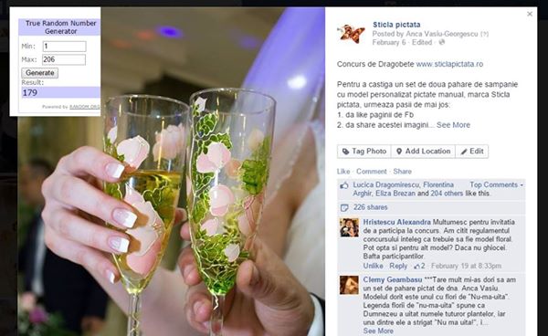 Castigatoarea concursului de Dragobete 2015 este Lorena Diaconu, din localitatea Pipirig, jud. Neamt. Felicitari! Ea si-a dorit un set de doua pahare de sampanie pictate manual cu ghiocei. Paharele sunt in lucru si vor ajunge in curand. Detalii aici.