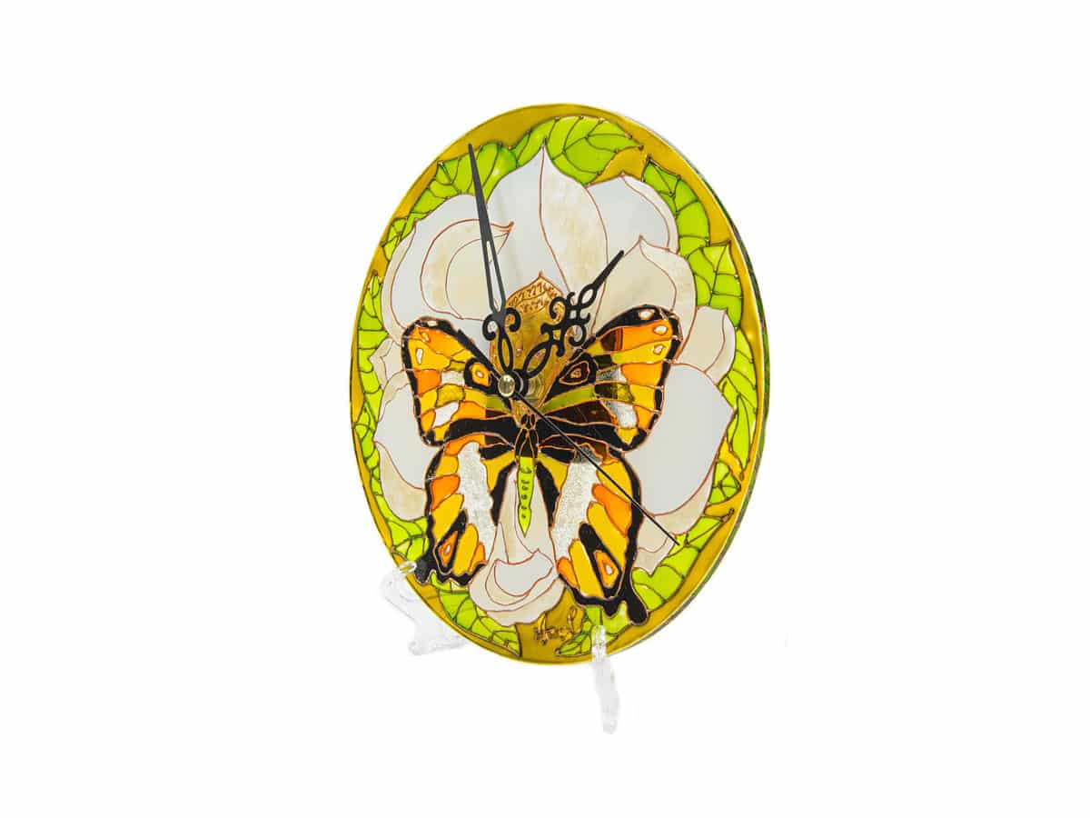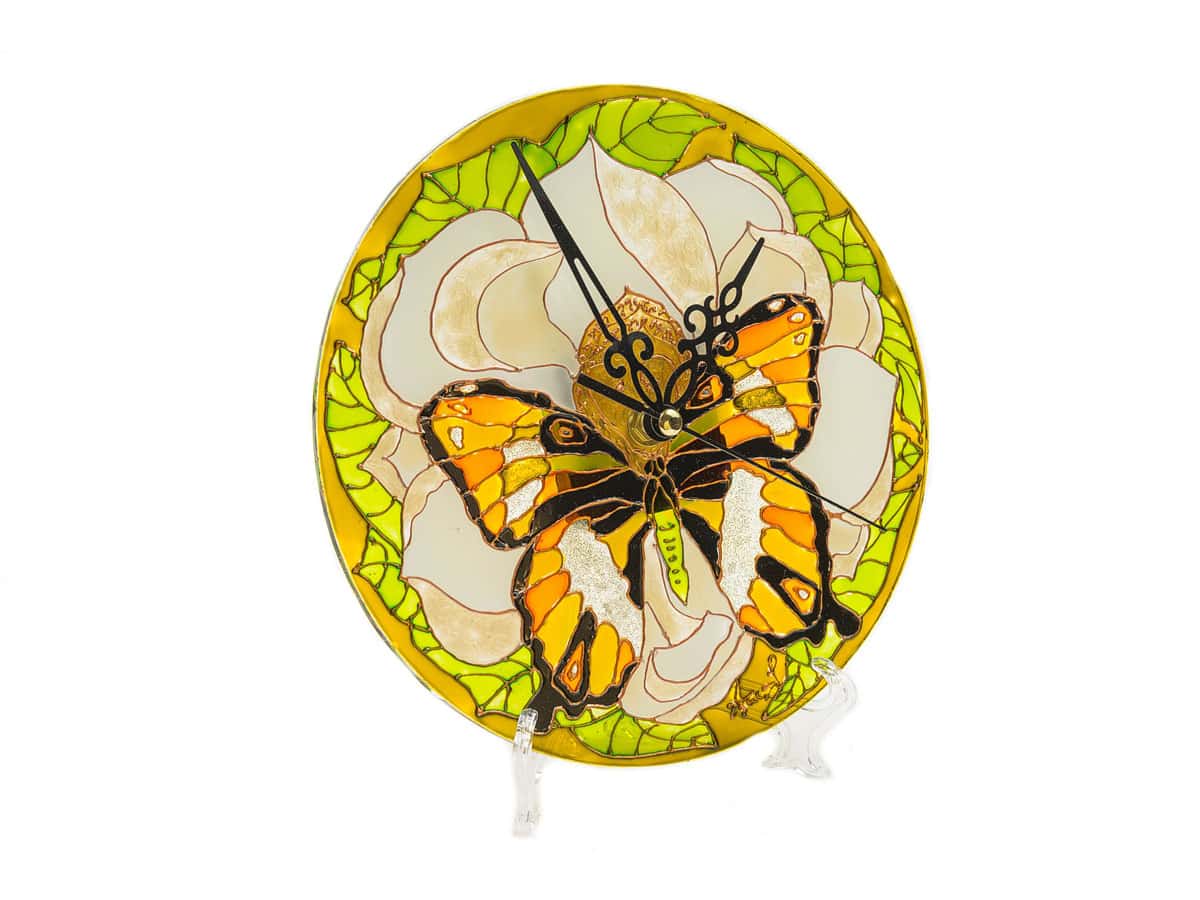 Ceas pictat manual pe cadran din sticla prevazut cu mecanism functional. Se poate fixa pe perete sau aseza pe un trepied. Da un aer de primavara si optimism incaperii in care este asezat.