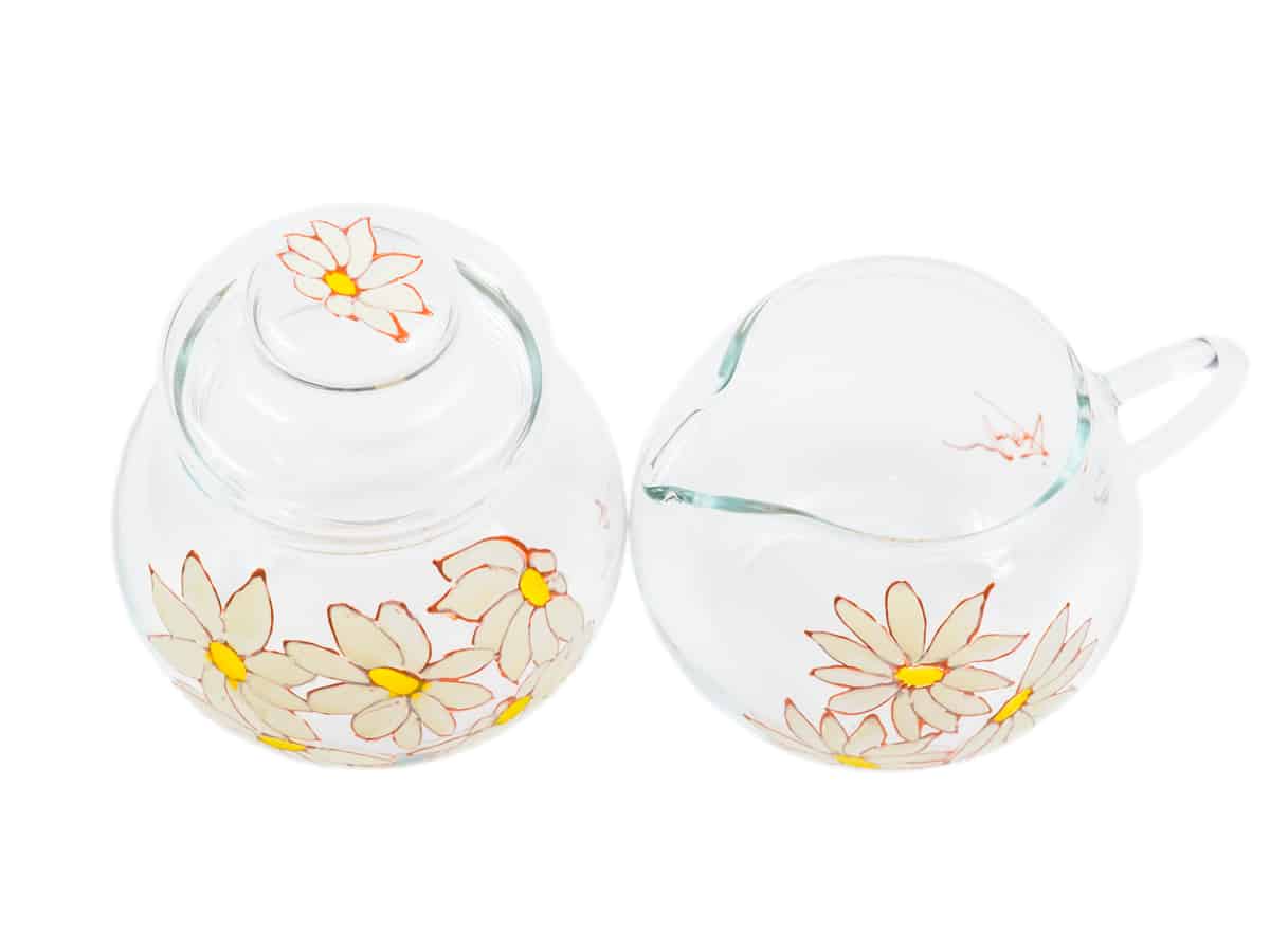 Setul compus din doua piese: zaharnita cu capac si cana de lapte este pictat manual cu margarete.
