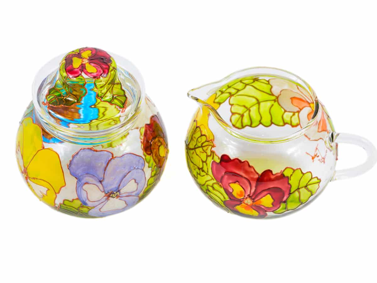Setul compus din doua piese (zaharnita cu capac si cana de lapte) este pictat manual cu panselute.