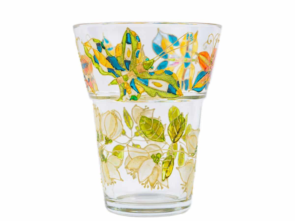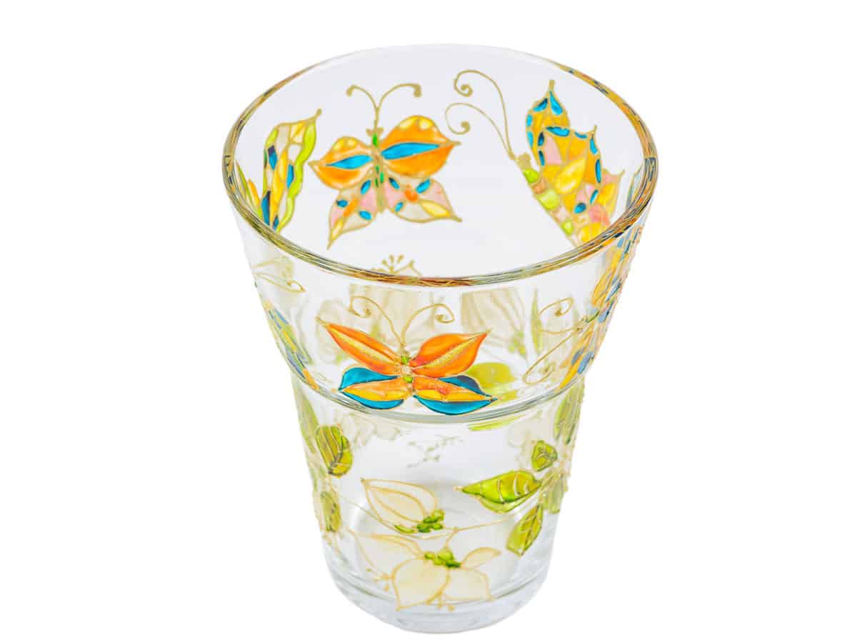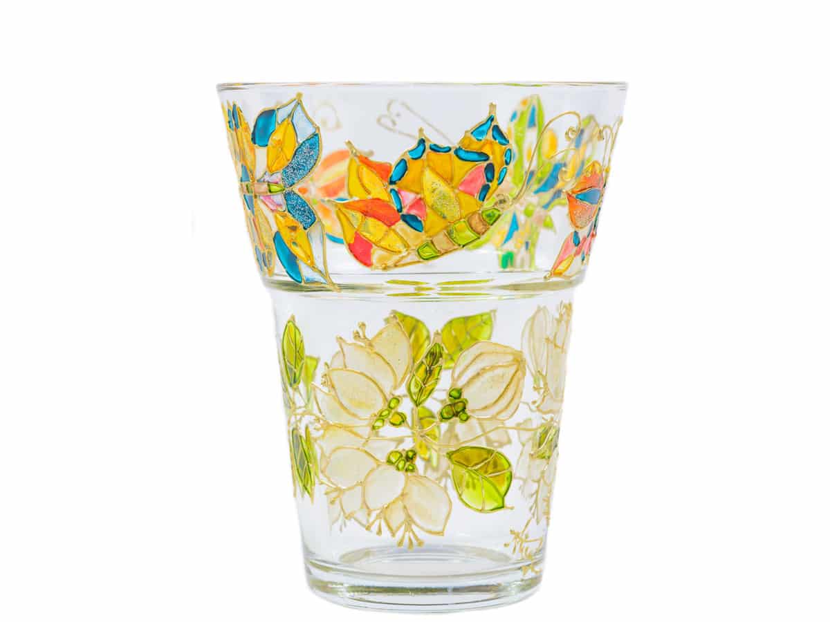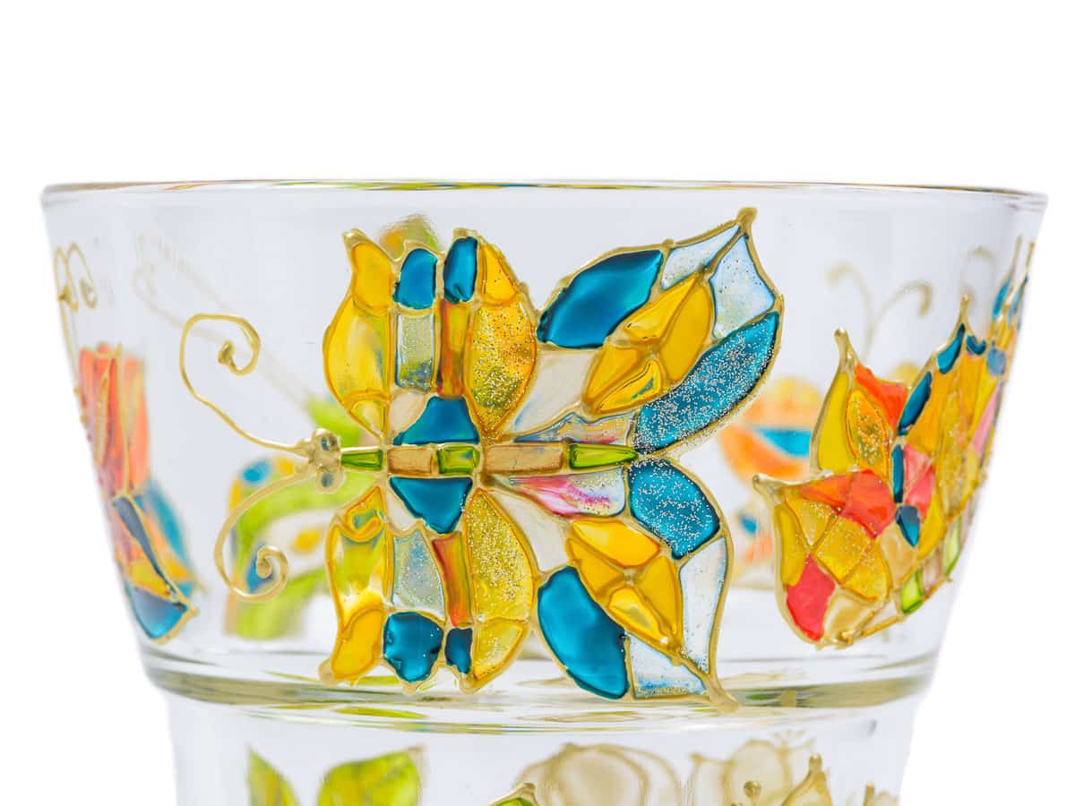 Culorile folosite sunt speciale pentru pictura pe sticla. Dupa uscare, suprafata colorata este rezistenta si suporta spalare usoara cu un burete fin de spalat vase cu apa rece/calduta si detergenti de vase.