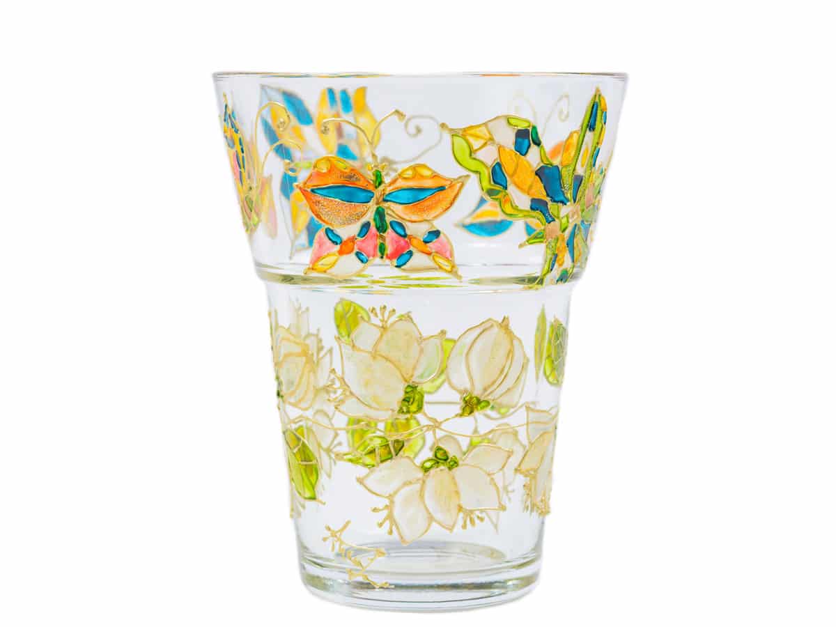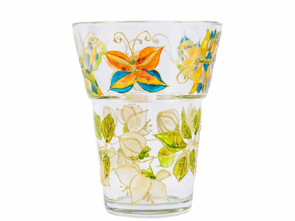 Vaza este pictata manual si are o forma evazata ce ii confera o buna stabilitate. Acest tip de vaza permite aranjarea cu suces a unei mari varietati de flori cu tije medii. Modelul pictat este alcatuit din doua registre. Primul registru reprezentand un alai de 4 fluturi multicolori imbraca circular bordura superioara a vazei. Baza vazei reprezentand al doilea registru este pictata cu o salba de flori de lamaita peste care zboara incantatorul cvartet de fluturi.