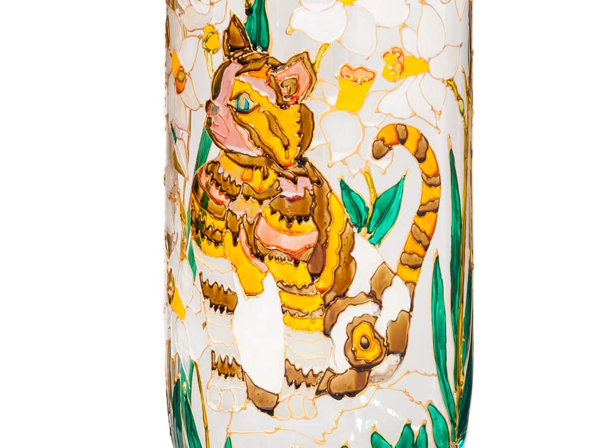 Vaza este pictata manual cu narcise si pisicuta si are forma cilindrica impunanduse ca dominant pe inaltime in orice spatiu. Modelul pictat este unul de primavara si reprezinta un fragment din aventurile prin gradina de flori a unui pui haios si tarcat de pisica.