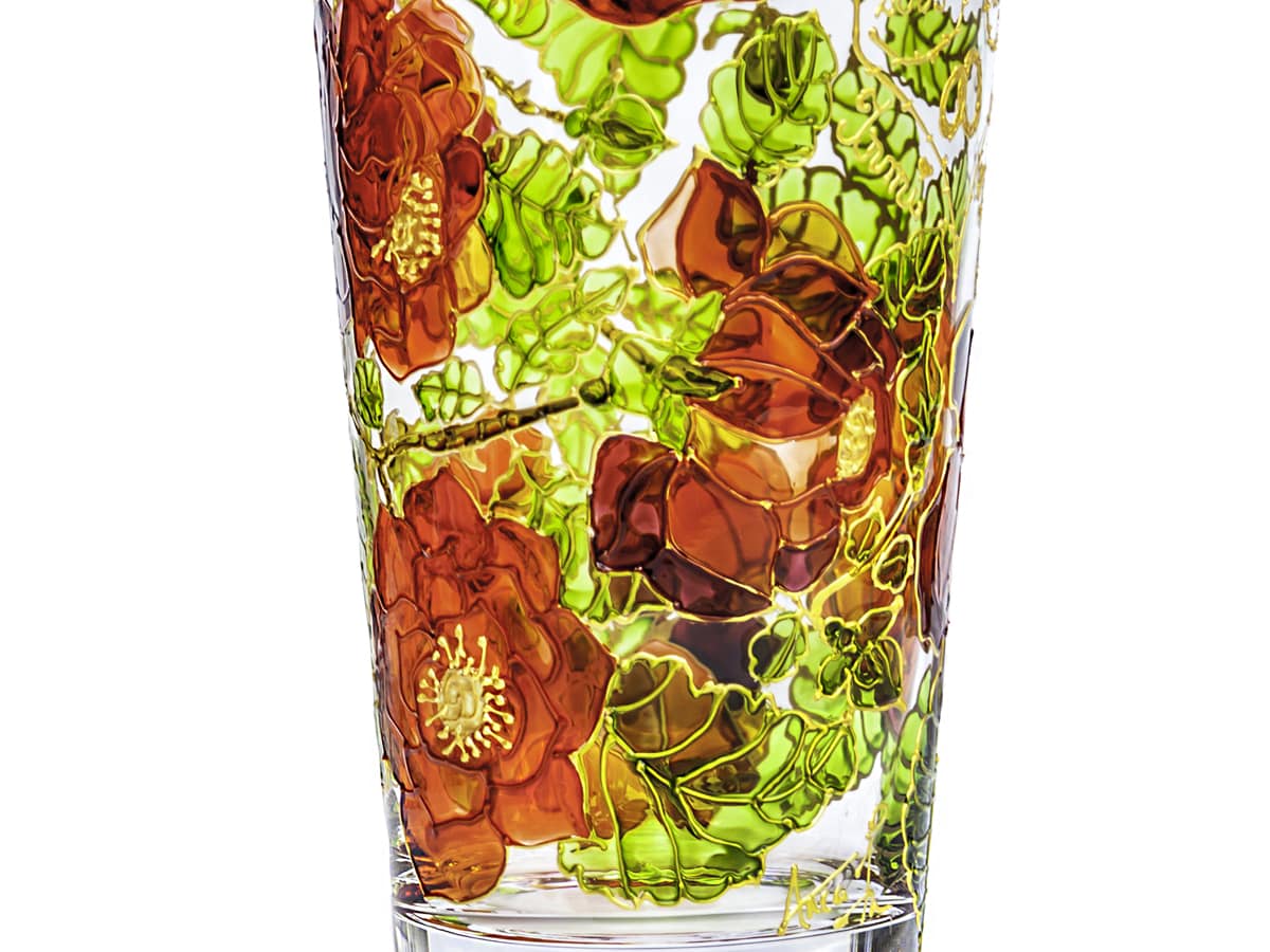 Vaza din sticla transparenta este pictata manual cu trandafiri agatatori rosii si are o forma de trunchi de con ce se deschide evazat in partea de sus. Trandafirii sunt printre cele mai iubite flori si cu ajutorul lor poti transmite multe mesaje frumoase in functie de cromatica lor si voi aminti doar cateva. Mesajele transmise cu ajutorul simbolisticii trandafirilor pot fi de: dragoste, prietenie, apreciere si recunostinta. Aceasta vaza pictata manual are niste proportii elegante si va decora cu succes orice spatiu interior in care va fi expusa aducandu-i o nota in plus de rafinament.
